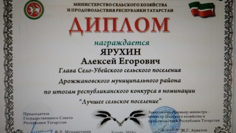 Дипломом ежегодного республиканского конкурса среди сельских поселений РТ по номинации «Обеспечение прироста поголовья и сохранение высокой насыщенности скота» среди сельских поселений муниципальных районов РТ награжден глава Село-Убейского СП Дрожжановского района Алексей Ярухин.