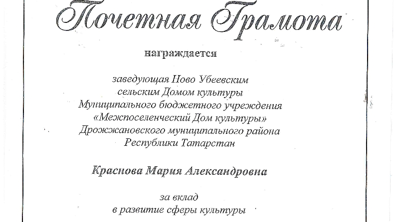 Краснова Мария Александровна, заведующая Ново Убеевским сельским Домом культуры награждена Почетной грамотой Министерства культуры Республики Татарстан за вклад в развитие сферы культуры.