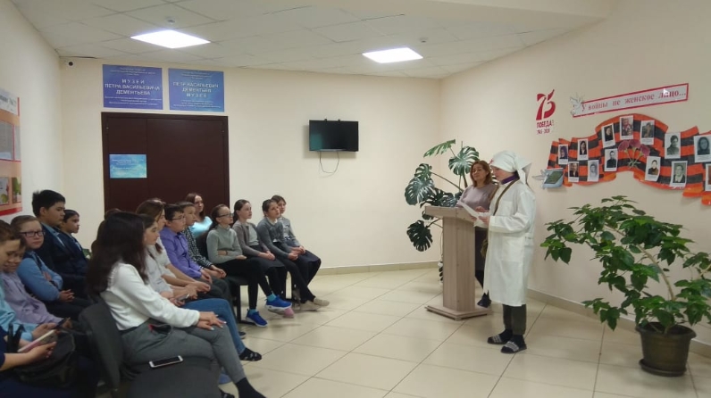 Мероприятие сопровождалось презентацией «Ушли девушки на фронт». Была показана видеозапись воспоминание о войне с Валентиной Калачевой. Ученица Василиса Павлова инсценировала стихотворение Ю.Друниной «Бинты». В конце мероприятия ребятам напомнили, что рядом с нами есть люди которые выстрадали для нас Победу. Под песню День Победы закончился урок-памяти.