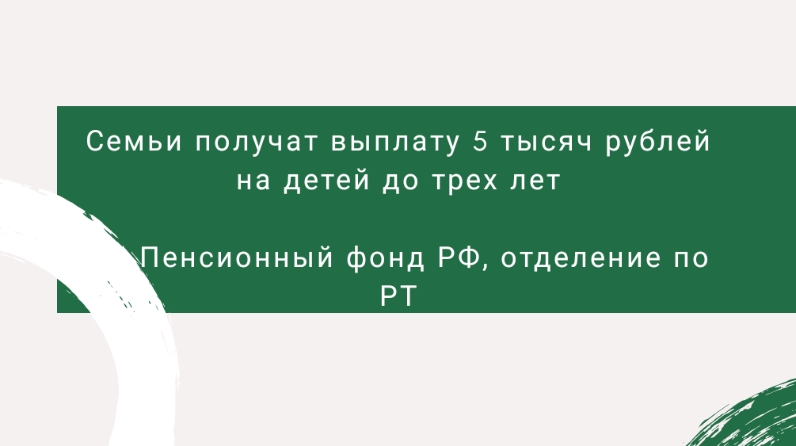 Отделение Пенсионного фонда России по Республике Татарстан сообщает, что в соответствии с указом Президента РФ № 249 от 7 апреля 2020 года российским семьям, имеющим или имевшим право на материнский капитал, с апреля по июнь устанавливается ежемесячная выплата в размере 5 тыс. рублей, которая будет предоставлена на каждого ребенка в возрасте до трех лет.