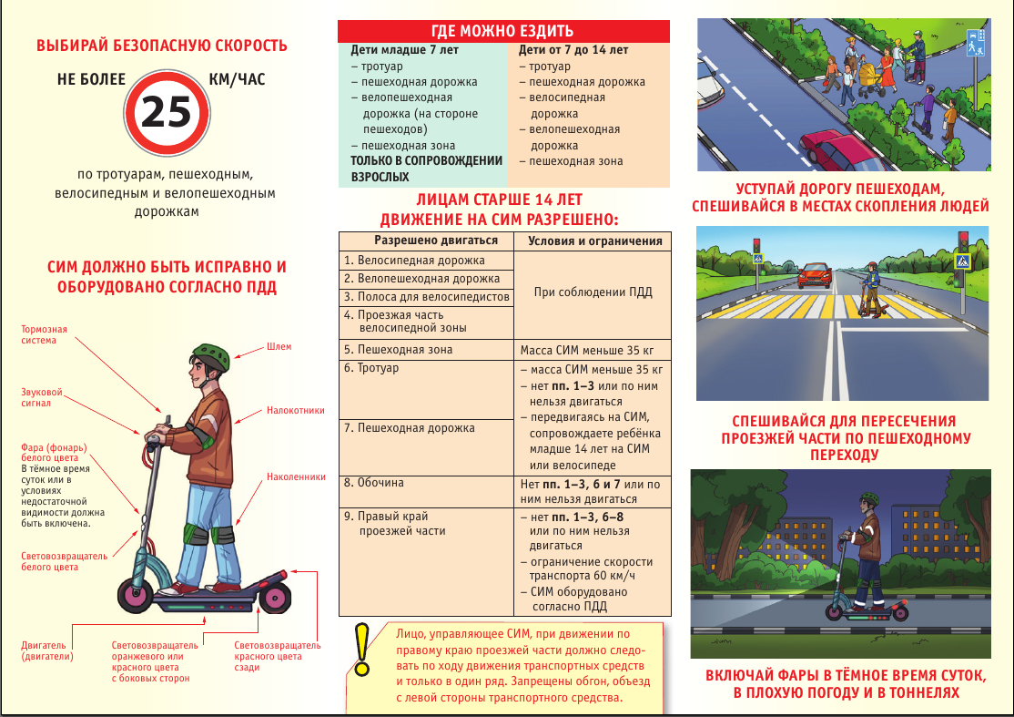 Правильный выбор маршрута: Передвигаться на СИМ разрешается по велодорожкам, велополосам, правому краю проезжей части при отсутствии велоинфраструктуры и тротуарам в режиме пешехода